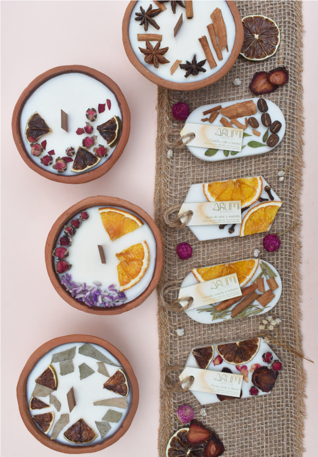 Arumi elabora ambientadores en formato de velas y sachets aromáticos, percibe las fragancias como algo más que solo olores agradables, creyendo firmemente en que éstas pueden reflejar la identidad de una persona, mejorar el bienestar emocional y construir recuerdos que perduren para toda la vida.